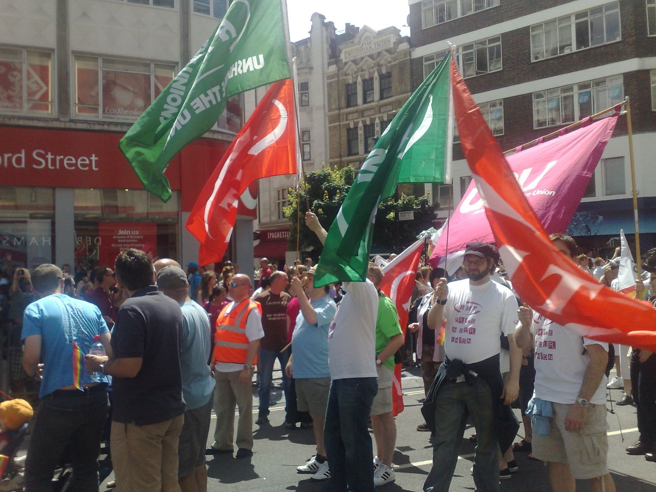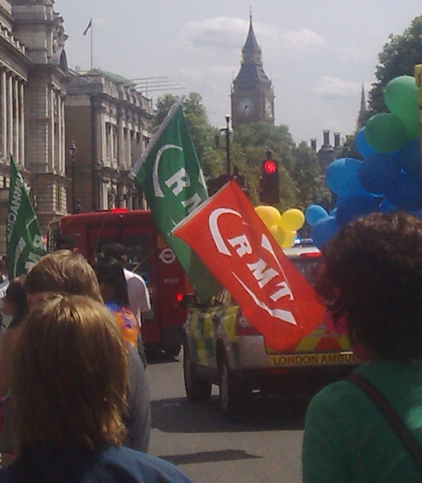 RMT activists joined the London Pride parade to show their solidarity with the unions LGBT members and to promote the unions pride in its own diversity.