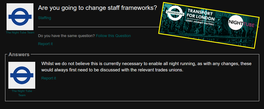 London Underground bosses have launched a new website for tube workers which supposedly provides some answers on what Night Tube will mean for us. However there is one big inaccuracy. A question on the site asks “Are you going to change staff frameworks?” And the answer given is that “we do not believe it is currently necessary”.